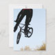 Foto eines BMX Bikers, der hoch in einen hellblauen Himmel springt