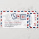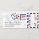 Ein Boardingdurchlauf inspirierte Karteneinladung mit Spaßpass-Briefmarkendetails und Luftpoststreifen. Gezeigt in den Schatten der Marine, des Rotes und des Graus. Rückseite umfaßt zusätzlichen Raum zu jeder möglicher Hotel-, Reise- oder Websiteinformation.