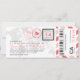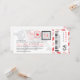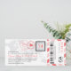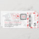 Ein Boarding Pass Einladung mit lustigen Pass Briefmarke Details und Luftpost Streifen. In Rosa-, Grau- und Schwarz-Tönen dargestellt. Die Rückseite bietet zusätzlichen Platz für alle Hotel-, Reise- oder Website-Informationen.