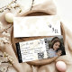 Moderner, minimalistischer Monogramm-Boarding passieren Hochzeitsfahrkarte mit einem schlichten, weißen und braunen Hintergrund, ein Foto des verlobten Ehepaares, ein Flugzeug mit Loop-Trail und eine leicht anpassbare Save the Date Vorlage. Vergessen Sie nicht, den Text auf der Rückseite des Monogramms zu ändern.