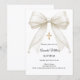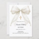 Feiern Sie die Taufe Ihres Kindes mit dieser eleganten elfenbeinfarbenen Bogen-Einladung, die mit einem zeitlosen Satin-Schleifchen, zarten Perlen und einem klassischen goldenen Kreuz verziert ist.