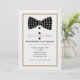 Eine vielseitige Bogen-Krawatteneinladung dieses perfekte während irgendeines Alters! Der subtile grau-gesäumte Hintergrund ist in Tan gerahmt und kennzeichnet eine schwarze Bogen-Krawatte mit tan Polkapunkten. Die Knöpfe des Schwarzen 3 können beseitigt werden. (FP)