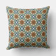 A striking decorative throw pillow featuring a complex, symmetrical geometric repeat pattern. The design is characterized by large starburst or floral motifs in rich terracotta/rust color, interspersed with white "X" shapes set against a background of dark navy blue and seafoam green/teal. The warm, rustic earth tones combined with the contrasting navy and crisp white give this pattern a distinct bohemian, Moroccan tile, or tribal textile aesthetic. Perfect for adding a bold, cozy, and globally inspired element to your home decor.