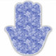 Farbenfrohe blau-weiße Hamsa Hand. Die Hand ist mit einem böhmischen, zarten Muster bedruckt.