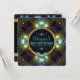 Schöne böhmische Schwarz-Licht-Kunst inspiriert Bat Mitzvah Einladung Design bunt uv Neon Farben aussehen. Goldene Rundplatte, die den Namen und die Veranstaltung mit einem niedlichen Juwelenbogen versehen, der für Ihre Prinzessin perfekt ist! Ein Glanz im dunklen Party inspirierte Design, kombiniert mit einem wunderschönen funkelnden Lichteffekt mit einem geometrischen Sternmuster aus schwarzhellem Fuchsienrosa und hellblauen Punkten. Das Design wird auf der Rückseite mit Platz für mehr Text fortgesetzt. | Mit Liebe erstellt von Webgrrl.biz