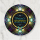 Schöne böhmische Schwarzlichtkunst inspiriert Bat Mitzvah farbenfrohe uv Neonfarben sehen Gastgeschenke aus. Goldene Rundplatte, die den Namen und die Veranstaltung mit einem niedlichen Juwelenbogen versehen, der für Ihre Prinzessin perfekt ist! Ein Glanz im dunklen Party inspirierte Design, kombiniert mit einem prächtigen funkelnden hellen Lichteffekt mit einem geometrischen Sternmuster aus schwarzem Fuchsienrosa und hellblauen Punkten. Das Design hat eine passende Einladung und eine RSPp-Karte | Mag mit Liebe Webgrrl.art