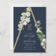 Eine wunderschöne, rustikale Holzpyramide im böhmischen Stil mit weißen Aquarellblumen, die auf der Seite mit einem blauen Hintergrund verziert sind. Ein einzigartiges Design, das Vintage weiße Wasserfarbenbotanikale auf einem böhmischen Dreieck verwendet. Ein charmantes weißes Blumendesign mit rustikalen und geometrischen Merkmalen und eleganter Schrifttyp. Ein elegantes Hochzeitsdesign Save the Date Kartendesign mit modernen Elementen. Auch die passenden Hochzeitseinladungen und andere Schreibwaren sind verfügbar.