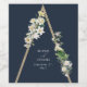 Eine wunderschöne, rustikale Holzpyramide im böhmischen Stil mit weißen Aquarellblumen, die auf der Seite mit einem blauen Hintergrund verziert sind. Ein einzigartiges Design, das Vintage weiße Wasserfarbenbotanikale auf einem böhmischen Dreieck verwendet. Ein charmantes weißes Blumendesign mit rustikalen und geometrischen Merkmalen und eleganter Schrifttyp. Ein elegantes Hochzeitsweindesign mit modernen Elementen. Auch die passenden Hochzeitseinladungen und andere Schreibwaren sind verfügbar.