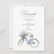 Diese inspirierte Hochzeitseinladung beinhaltet ein blaues Fahrrad mit einem Korb voller blauer und weißer Blume und ein Paar Liebhaber auf dem Fahrradsattel. Es ist einfach, süß und elegant und kann leicht mit den Informationen personalisiert werden. Besonders schön für eine Hochzeit im Frühling oder Sommer. Vervollständigen Sie den Look mit Schreibwaren und Zubehör Optionen in diesem Thema. Basierend auf einer originalen Aquarellfarbe von © Lisa Audit Art, umgeben Sie sich mit herzerwärmender Kunst.
