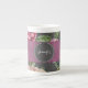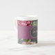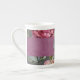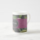 Schöne Knochen-China-Tasse mit einem dunklen Blumenhintergrund und Pflaume versehen mit einem Band. Personalisiert mit einem Namen. Würde ein perfektes Geschenk oder einen Akzent für Ihr Zuhause machen. Für mehr Zuhause sehen Zusätze, dass die Knoten u. die Küsse kaufen.