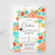 Bohemische, hellorangefarbene Blütenpartyveranstaltung mit handgemalten bohu-blauen Orangen-Rose, Blume, blauen Blüten und grünen Blätter und Blättern mit einem modernen Script-Bürste-Schriftart.