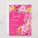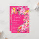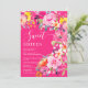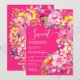 Bohemische Blumenfarbe Sweet 16 Geburtstagseinladung mit handgemalten, hellen Blüten pink, orange, gelb Blumen und grünen Eukalyptus-Blätter und indigofoliage mit einem modernen Skript-Pinsel-Schriftart auf heißen Neonpinken. Die perfekte Brautbar lädt zum Frühling und Sommer, zum Party im Garten und im Freien ein.