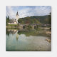 Souvenir Foto Magnet mit einer Bohinj Seenlandschaft mit ruhigem Wasser und Reflektion der St. Johannes der Taufkirche und der Steinbrücke in Ribcev Laz, Slowenien, zu Beginn der Herbstsaison.
