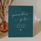 Dieses aquamarin blaue Hochzeitszeichen der Liebe ist perfekt für eine minimalistische Hochzeit. Der kühne, dunkeltürkisfarbene Juwelenton des modernen böhmischen Designs zeichnet sich durch eine einfache rustikale Kalligraphie mit einem einzigartigen und dennoch klassischen Stil aus. Das Zeichen lautet: Generationen von Liebe. Alles, was wir sind, alles, was wir hoffen zu sein, schulden wir unseren liebevollen Familien.
