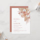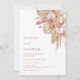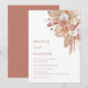 Diese elegante zeitgenössische Hochzeitseinladung zeigt aquarellgemalte Orchideenblüten und Terrakotta-Pampasgras auf weißem Hintergrund.