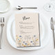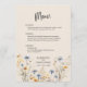 Dieses BOHO Watercolor Wildblumen Elegant Beige Wedding Menu bietet wunderschöne blaue und gelbe Wildblumen, Menüoptionen, optionalen Text auf der Rückseite und moderne Typografie. Ihre Hochzeitsgäste haben die Liebe, bei Ihrer Hochzeit eine Auswahl an Speisen zu haben. Dieser Eintrag koordiniert mit der BOHO Wildblumen Elegant Beige Wedding Suite. #wildflowerwedding #purplewedding #bluewedding #yellowwedding #goldwedding #formalwedding #elegantwedding #floralwedding #beigewedding