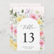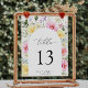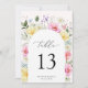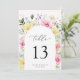 Boho Arch farbenfroher Blumengarten Elegante Hochzeitsfeier Tischnummer. Diese Hochzeitsvorlage zeigt einen wunderschönen, blumengrünen Botanischen Botanischen Bogen mit bunten rosa, orangefarbenen, blauen, gelben und weißen Blume. Der farbenprächtige Pop mit seinem farbenfrohen, blumengeschmückten Hintergrund ist für die Frühlingsgärten und die bunten Hochzeiten im Sommer wunderschön.