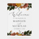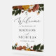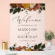 Rustikales Begrüßungszeichen mit Aquarell-Blume und Grün in abgedämpften Herbstfarben Elfenbein, Orange, Senfgold, Olivgrün, staubige Rose und Braun mit einem mattierten Acrylhintergrund in Imitaten. "Willkommen" wird in einem modernen Kalligraphieskript mit Ihren Namen und Hochzeitstermin angezeigt. Entworfen, um mit unserer Boho Herbst Floral Hochzeitskollektion zu koordinieren.