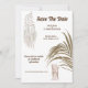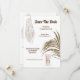Zwei Holzstühle, die mit weichem, an der Rückseite befestigten Chiffon aufgereiht sind, werden von einem großen Single aus Blattblättern gerahmt. Ein hübscher, weißer Traumfänger mit geflochtener Spitze und langen hängenden Federn erscheint in der links oberen Ecke und die Text-Vorlagen für Ihre Ehedetails erscheinen zwischen den eleganten Illustrationen. Ein schönes, lang fließendes Hochzeitskleid, das an einem Kleiderbügel hängt, erscheint auf der Rückseite. Diese minimalistischen und dennoch luxuriösen Einladungen sind ideal für Strand, Sommer, afrikanische Safari, Dschungel, Außen- und Waldhochzeiten.