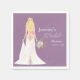 Diese Papierserviette mit dem Thema Boho besticht durch einen anmutigen Perlenvorhang und eine atemberaubende Boho-Braut mit blonden Haaren in einem zarten Hochzeitskleid. Verziert mit einem üppigen Blumenstrauß aus Rose, Pampasgras, Eukalyptus und Ranunculus.