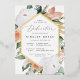 Die elegante Blumen-Widmung lädt mit einem lang gestreckten sechseckigen Rahmen aus Aquarellfarben und Blattwerk in boho Wüste inspirierte Pfirsichfarben, Weiß, Elfenbein und Salbei-Grün und mit Goldfolienbespannung zum Verweilen ein. Personalisieren Sie mit Ihrer Kirchenfeier und Party Details in modernen Schriften.
