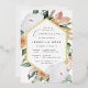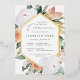 Elegante florale erste heilige Kommunion Einladung zeigt einen lang gestreckten sechseckigen Rahmen aus Aquarellfarben und Blattwerk in boho Wüste inspirierte Pfirsichfarben, Weiß, Elfenbein und Salbei grün und mit goldenen Folie besticht. Persönlich gestalten Sie Ihre Kirchenfeier und Ihre Kommunion Party Details in modernen Schriften.