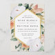 Elegante Blumen-Hochzeitseinladung kennzeichnet Ihre Hochzeitsdetails in modernem Schriftsatz, Set in einem geometrisch länglichen sechseckigen Rahmen von pastellfarbenen Aquarellfarben-Blume und botanisches Blattwerk in Wüste inspiriert Erdtontöne von Pfirsich, Salbei, Weiß und Elfenbein. Die Goldfolienbespannung rundet das Aussehen nach einer luxuriösen Touch ab.