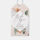 Bringen Sie diese eleganten botanischen Tags an Ihre Hochzeit oder Gastgeschenke, um sich bei den Gästen in schicken Stil zu bedanken. Die Tags sind mit einem geometrischen, weißen Element umgeben von Aquarellfarben und Blattwerk in sanften Wüsten inspirierte Pfirsichtöne, Creme, Weiß und Salbei grün, Rahmen "danke" und Ihre Namen und Hochzeitstag in weichem Schwarz. Entworfen, um unsere Boho Blooms Hochzeit- und Veranstaltungsportery Kollektion zu ergänzen.
