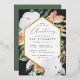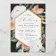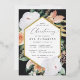 Elegante florale Taufeinladung mit einem lang gestreckten sechseckigen Rahmen aus Aquarellfarben und Blattwerk in boho Wüste inspirierte Pfirsichfarben, Weiß, Elfenbein und Salbei grün, fertig mit Goldfolienbespannung. Persönlich gestalten Sie Ihre Kirchenfeier und taufende Party-Details in modernen Schriften.