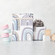 Niedliche und skurrile Babydusche oder Babygeschenkverpackung mit Regenbogen. Regenbogenmuster