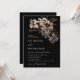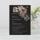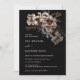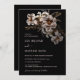 Diese dunkle, stimmungsvolle Hochzeitseinladung enthält neutrale Farben und cremeweiße Blumen und Grün auf schwarzem Hintergrund.