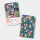 Charmantes vertikales Abzeichen für Innenarchitekten, Stylist, Makeup-Künstler oder Ähnliches mit handgezeichnet Blume in lebhaften Farben vor blauem Hintergrund und einer rot-rosa Aquarellstruktur. Personalisieren Sie Ihre Daten mit Ihrem Namen, Titel und Foto.
