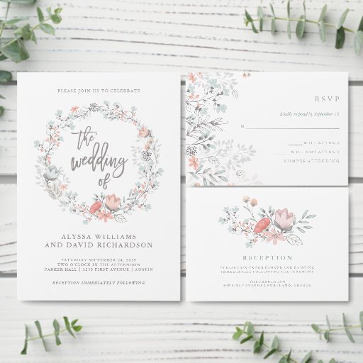 Dieses zarte botanische Hochzeitsdesign besticht durch die Farbtöne von Korallen, Pfirsich, Grau und Blau sowie durch zahlreiche Blätter, Blume und Akzente.
