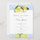 Eine schicke, moderne und trendige Brauttee-Party-Dusche mit gelben Zitronen, handgezeichnet in Aquarell und Farbstiften über ein Aquarellmuster von blauen Fliesen, inspiriert von den mediterranen Traditionen. Personalisieren Sie es mit dem Namen, dem Datum, der Uhrzeit und allen Details. Moderne Kalligraphie für den Namen der Braut und ein goldener Rahmen für den Hintergrund.