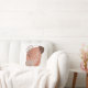Die Einrichtung ist modern und neutral, das braune Beige und die dunkelpfirsichfarbene Farbe sind in abstrakten Formen und Blätter gehalten.