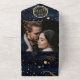 Erleben Sie die himmlische Magie Ihrer Liebe mit unserer einzigartigen eleganten, modernen Celestial All-in-One Hochzeitseinladung. Verziert mit einem romantischen Monogramm aus Gold auf einer faszinierenden Szene des Mondes und der Sterne, zeichnet es sich durch ein gepflegtes Foto des Paares aus. Beinhaltet Ihr Foto, Ihre Website und Ihren QR-Code für UAWG und zusätzliche Informationen, um eine personalisierte Einladung zu erarbeiten, die die Schönheit Ihrer Reise zusammen unter dem Himmelbett beleuchtet.