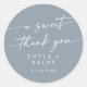 Dieses schicke, staubige Blau ein Dankeschön an klassische Rundaufkleber ist perfekt für eine minimalistische Hochzeit. Das neutrale hellblaue graue moderne böhmische Design zeichnet sich durch eine einfache rustikale Kalligraphie mit einem einzigartigen und dennoch klassischen Stil aus. Personalisieren Sie Ihre Gunst-Aufkleber mit Ihren Namen und Hochzeitsdatum.