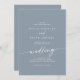 Diese schicke, staubblaue Vorder- und Rückseite-Hochzeitseinladung ist perfekt für eine minimalistische Hochzeit. Das neutrale hellblaue graue moderne böhmische Design zeichnet sich durch eine einfache rustikale Kalligraphie mit einem einzigartigen und dennoch klassischen Stil aus. Rett Papier, indem man mehr Details auf der Rückseite der Einladung anstatt auf einer separaten Gehäusekarte angibt.