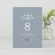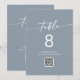Diese schicken, staubblauen QR-Tischnummern sind perfekt für eine minimalistische Hochzeit. Das neutrale hellblaue graue moderne böhmische Design zeichnet sich durch eine einfache rustikale Kalligraphie mit einem einzigartigen und dennoch klassischen Stil aus. Das Design druckt vorne und hinten. Geben Sie Ihre Webadresse in den QR-Code-Bereich der Vorlage ein, und der QR-Code aktualisiert und verlinkt automatisch auf Ihre Website. Personalisieren Sie jede Tischnummer, die Sie benötigen, und fügen Sie jede einzeln in Ihren Warenkorb ein.