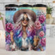 Eine stilvolle Frau mit langen, fließenden blonden Haaren mit lebhaften, blauen, rosa und lila Highlights trägt einen breit gebrannten Hut und eine Sonnenbrille, die ein helles Lächeln blinkt. In der einen Hand hält sie einen eiskalten Kaffee und in der anderen einen Ringelgurt, umgeben von üppig rosa und lila Pfannkuchen. Der Hintergrund ist eine Mischung aus schimmernden Pastelltönen und einem subtilen Leopardenprint.