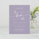 Dieser schicke Lavendel lila QR Code Spanische Hochzeitseinladung ist perfekt für eine minimalistische Hochzeit. Das bunte, staubige lila, moderne böhmische Design zeichnet sich durch eine einfache rustikale Kalligraphie mit einem einzigartigen und dennoch klassischen Stil aus. Fügen Sie einen QR-Code auf der Rückseite Ihrer Hochzeit laden Sie für den Gast zu leicht UAWG, sehen Sie Details, oder beides.