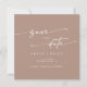 Dieses schicke, neutrale, taupe Foto Save the Date ist perfekt für eine minimalistische Hochzeit. Der beige braune Erdenton des modernen böhmischen Designs zeichnet sich durch eine einfache rustikale Kalligraphie mit einem einzigartigen und dennoch klassischen Stil aus. Personalisieren Sie Ihre Save the Date mit Ihren Namen, Hochzeitstermin, Ort, Verlobung Foto und Ihrer Hochzeitswebsite-Adresse.