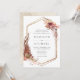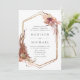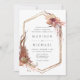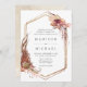 Elegante, einmalige Blumenzettel mit Ihren Hochzeitsdetails, gerahmt von bordeauxroten, lila, rot- und korallenfarbenen Blume, reichhaltigem beige- und braunem Erdton und einem geometrischen Rahmen aus Imitaten mit Goldfolie. Die Einladung kehrt zu einem hellbeigen Aquarell-Hintergrund zurück.