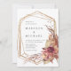 Elegante, einzigartige Blumenzettel mit Ihren Hochzeitsdetails, gerahmt von einem geometrischen Rahmen aus vergoldeten Imitaten mit bordeauxfarbenen Blume, lila, rot und korallenfarben, die reich an beige- und braunen Erdtönen sind. Die Einladung kehrt zu einem hellbeigen Aquarell-Hintergrund zurück.