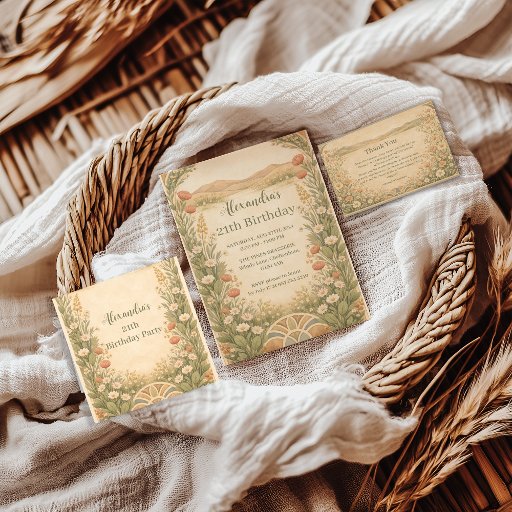 A soft, sun-washed desert birthday design featuring hand-painted wildflowers, gentle hills, and a warm neutral palette. The illustration has an elegant, vintage-inspired feel that works beautifully for milestone birthdays, garden celebrations, or relaxed outdoor gatherings. Fully customizable with your event details for a refined yet effortless look.