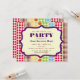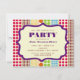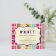 Eine generische Party Einladung für Allzweck mit einem Hintergrund von Reihen von Polka-Punkten in verschiedenen Größen und bohemian Farben auf der Vorder- und Rückseite. Personalisieren Sie den bordeauxfarbenen und lila Text im Rahmen vorne mit Details zu Ihrem Anlass.