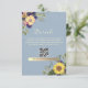 Elegante, rustikale, boho, botanische, staubblaue Hochzeitsdetails-Karte mit QR-Code, Website, Aquarellfarben-Blume und Sonnenblumen.