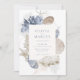 Boho Rustic Elegant am Strand Dusty Blue einfache Hochzeit Einladung. Bohemische Muscheln mit minimalistischer Einladung, mit eleganten und schlichten böhmischen Muscheln und cremefarbenen Korallen in handgeschriebenem Aquarell. Die dunkelblaue Hintergrundfarbe ist wunderschön für Hochzeiten und Hochzeiten am Strand. Einladungen für Frühjahr, Sommer, Herbst und Winterhochzeiten.
