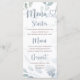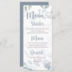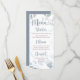 Ihre Gäste werden diese koordinierende, staubige blaue Menükarte lieben. Es zeichnet sich durch ein sanftes Blumendesign und Eukalyptusdesign mit eleganter romantischer Kalligraphie in staubblauer Farbe aus. Passen Sie Ihre Menükarte individuell an.