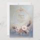 Invite your guests to a celebration of opulent romance and ethereal beauty with this exquisite wedding invitation. The design centers on a stunning central thin gold circular frame set against a soft, luminous pale blue and lavender backdrop. The frame is intricately detailed with ornate baroque scrollwork and highlighted by striking purple and pink gemstone accents. This entire composition is gorgeously framed by a lavish wreath composed of soft, layered beige and brown feathers, accented by pristine white and soft pink daisy-like flowers. The aesthetic beautifully merges the earthy, organic texture of feathers with rich, antique metallic accents, perfectly setting the stage for a luxurious, stylish, or celestial-themed wedding. This invitation card is ideally suited for a bohemian style wedding, a chic formal engagement celebration, or an elegant celestial-themed party. It would also perfectly suit a sophisticated winter destination event or a serene, elegant vow renewal ceremony.